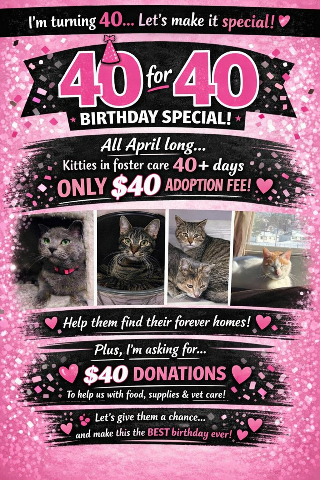 Any kitty who has been in foster care for over 40 days will have an adoption fee of just $40 🥹