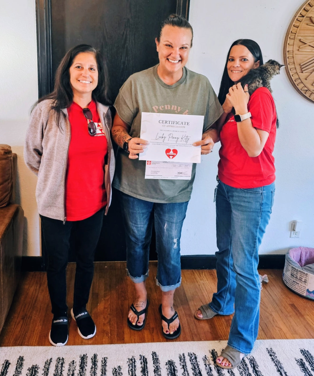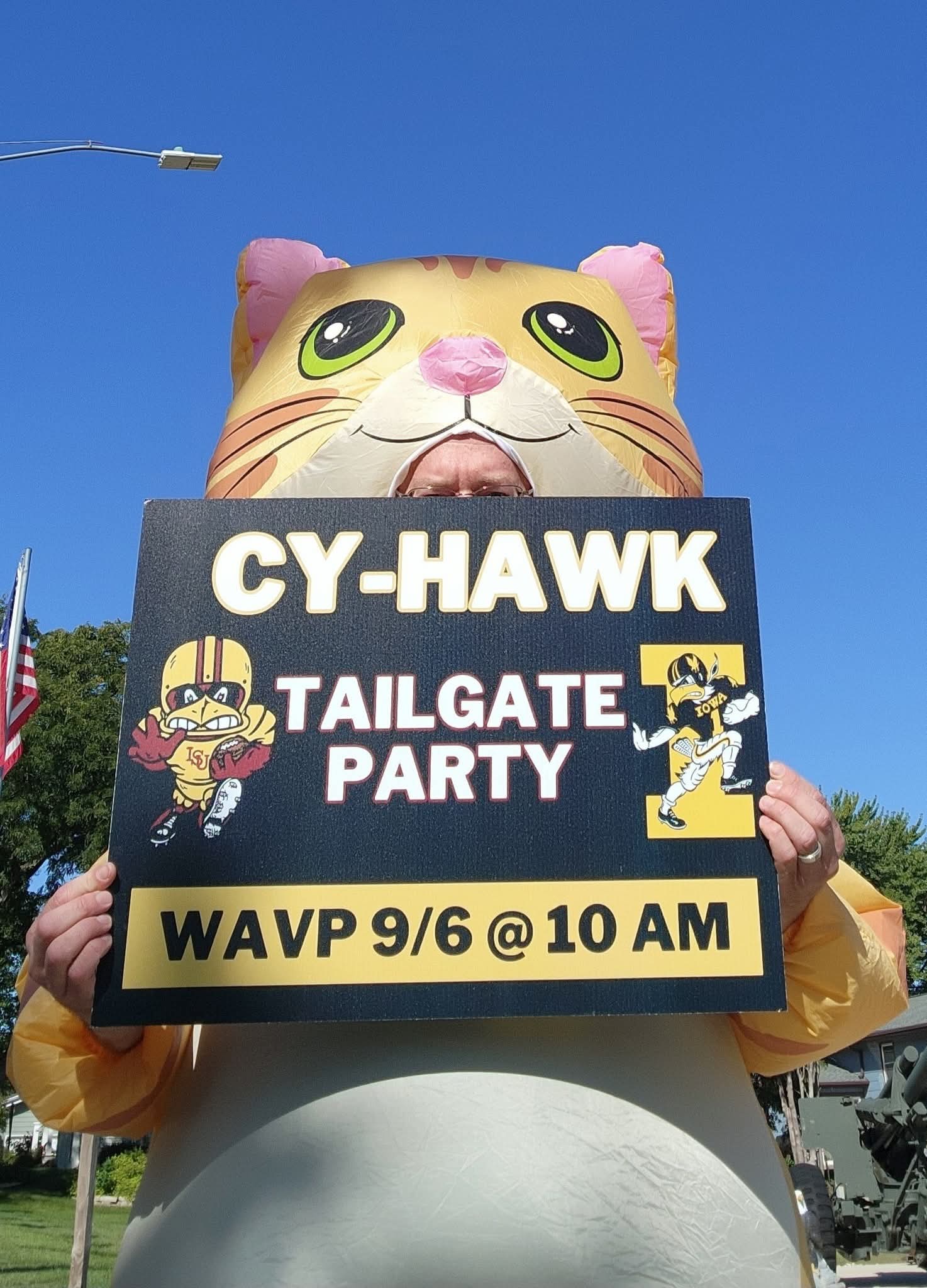 Lucky the Cat, our fun mascot, proudly displaying one of our yard signs!