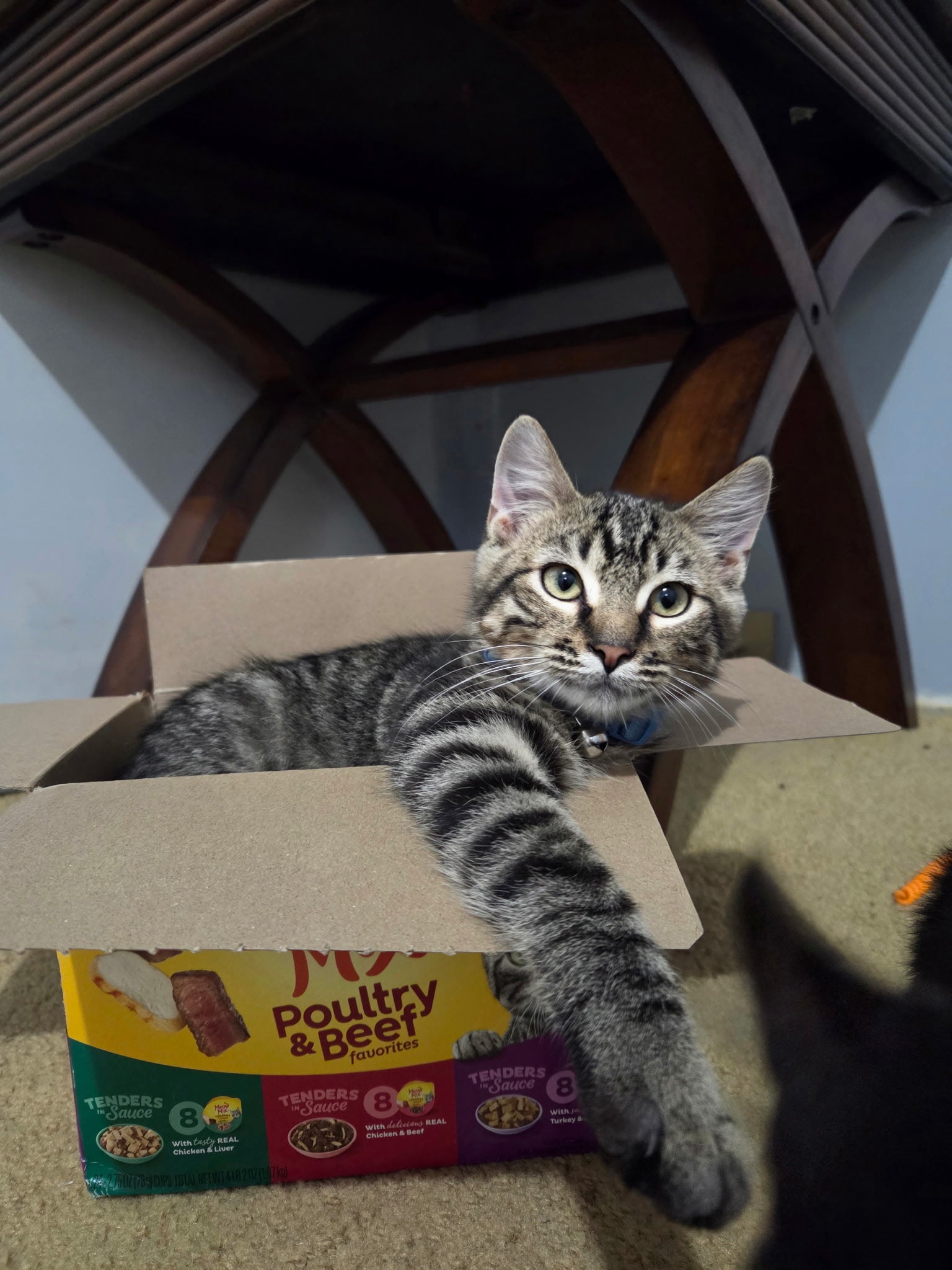 Rescued from a burn pit with a canister stuck around his head on Thanksgiving, this little guy is a fighter and Lucky to be alive! He had to have the canister cut off of him 💔 He is roughly 2 to 2 1/2 month old. Very sweet with a loud purr box! Gets along very well with Lucky!